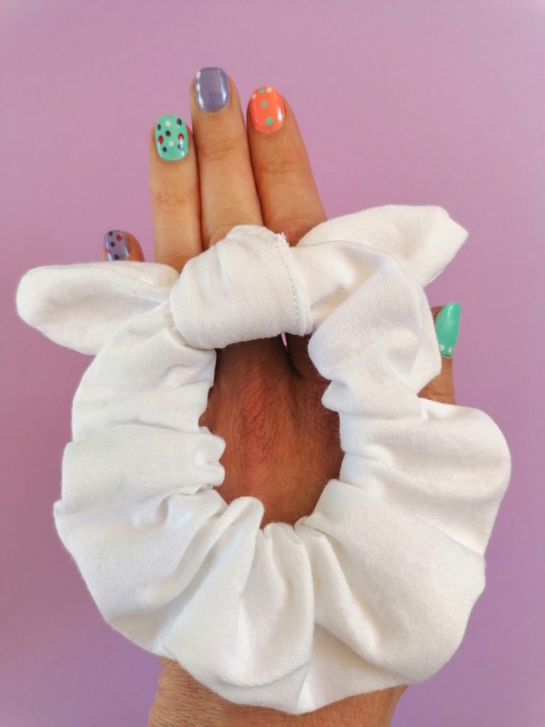 Λευκό , βαμβακερό , χειροποίητο λαστιχάκι φρουφρού για τα μαλλιά , με φιογκάκι από το ίδιο ύφασμα !
