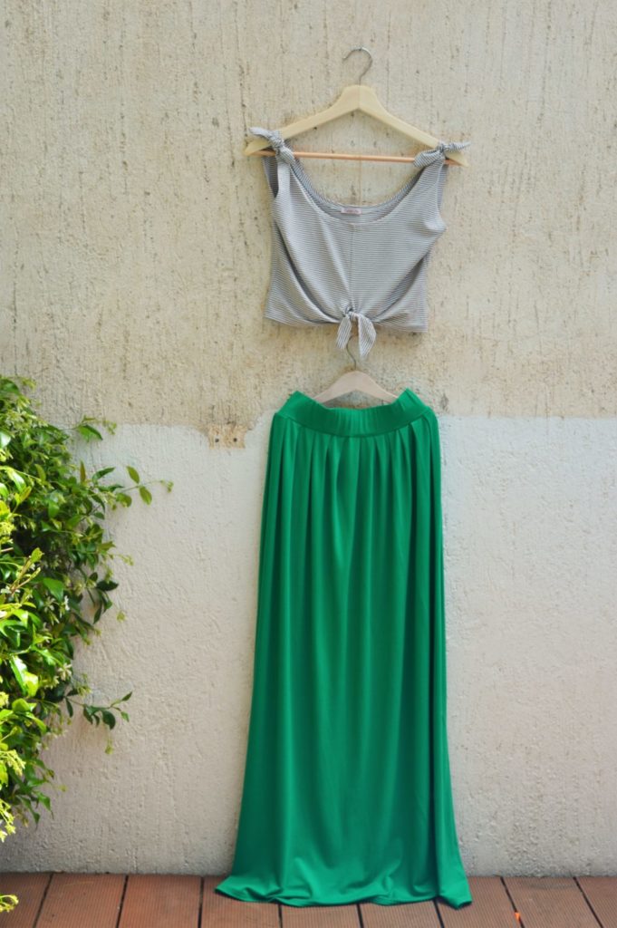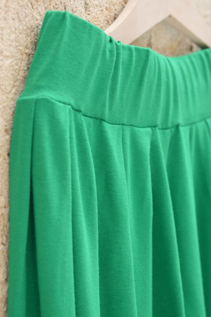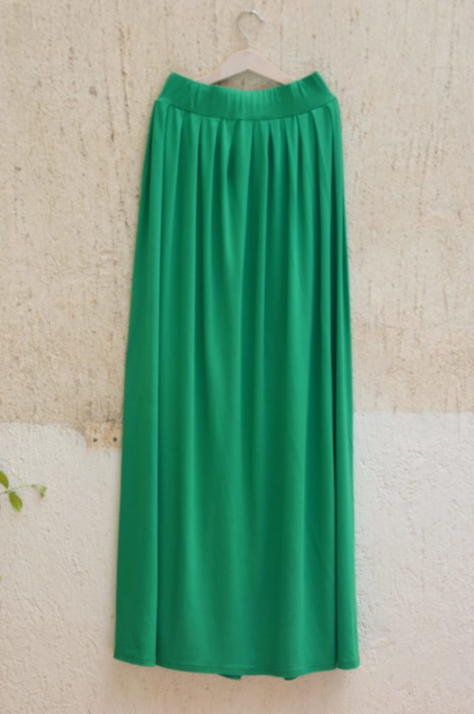 Green , long , wide skirt , made of viscoze-lycra fabric , with comfortable fitting wide elastic band round the waist !