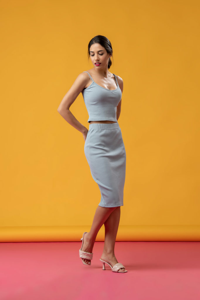 Φούστα midi, σιέλ παστέλ με λάστιχο στη μέση.