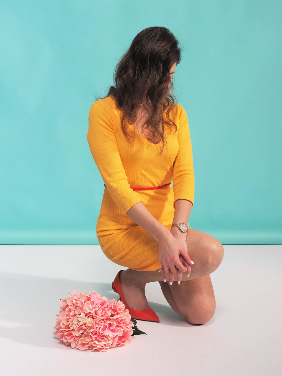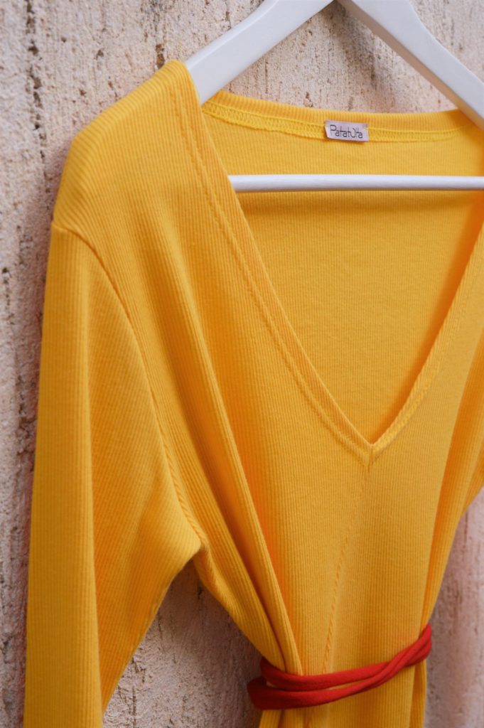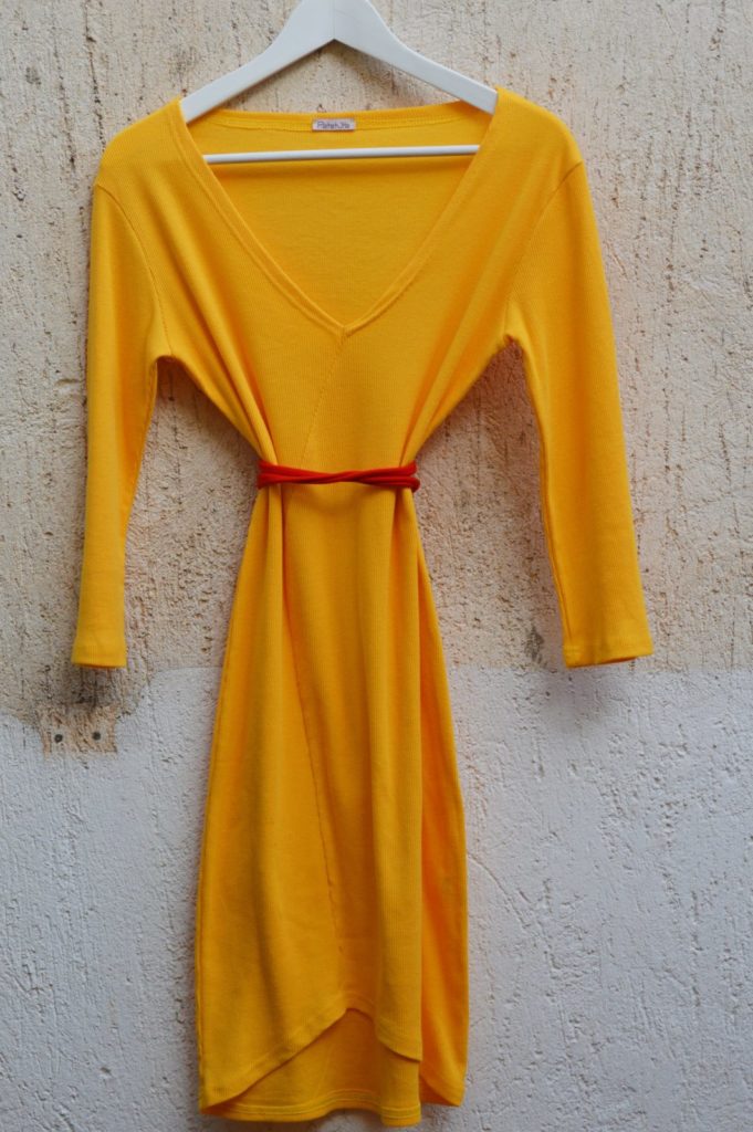 Mini , cotton , ribbed , stretch , dusty orange dress , with 3/4 sleeves and a V opening in the neckline ! With a special seam in the front and an opening on the lower front ! COT 95% LYC 5%