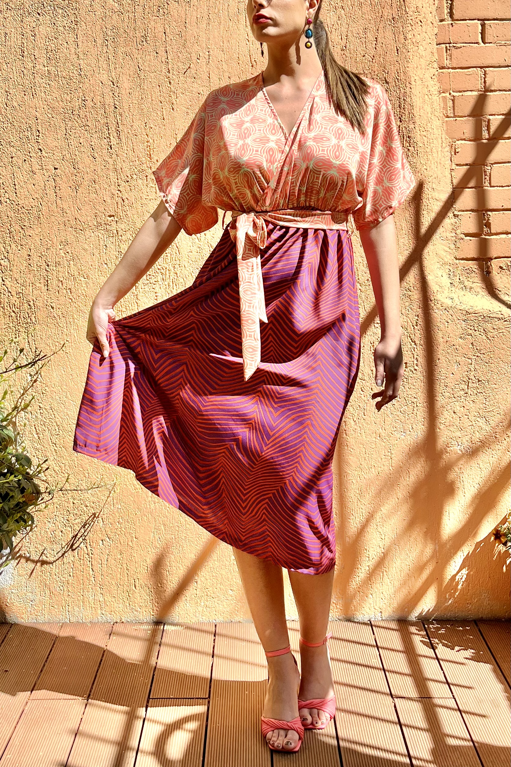 Μίντι φόρεμα ,με κοντό μανίκι ,κρουαζέ μπούστο και φούστα σε γραμμή άλφα!Με λάστιχο στη μέση για να εφαρμόζει τέλεια,αλλά και ζώνη!Το φόρεμα αυτό συνδυάζει δύο διαφορετικά υφάσματα !Φτιαγμένο από ανακυκλωμένο πολυεστερικό ύφασμα!