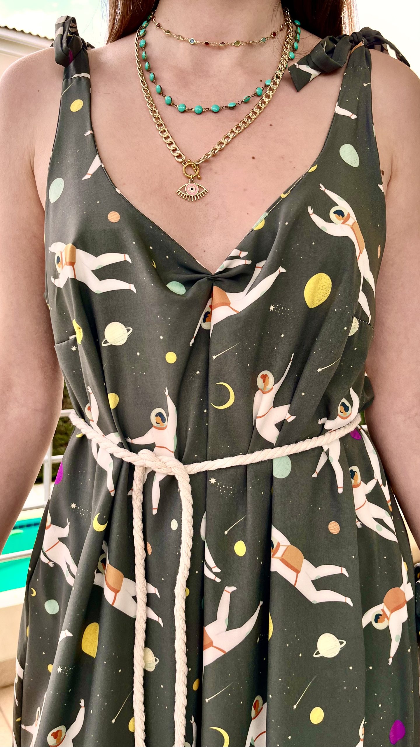 Maxi φόρεμα με δετές τιράντες ,σε φαρδιά , αέρινη γραμμή ! Δροσερό ανάλαφρο ύφασμα σε γκριζοπράσινη απόχρωση και pattern με κορίτσια και αγόρια αστροναύτες ! Συνοδεύεται από βαμβακερό κορδόνι !