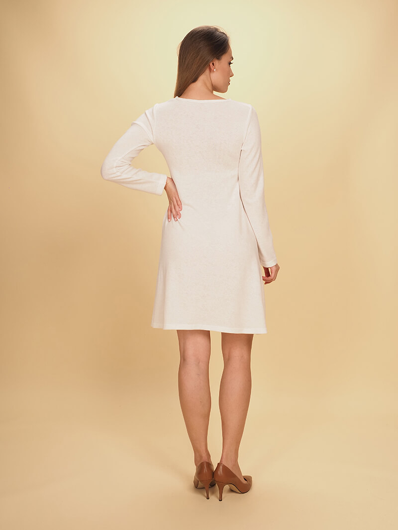 Mini, long sleeved knitted dress, , made of a warm, soft angora fabric, with a perfect fit around the bust, where there is an opening, decorated with small pearls! Tight up to the chest, in empire dress line!