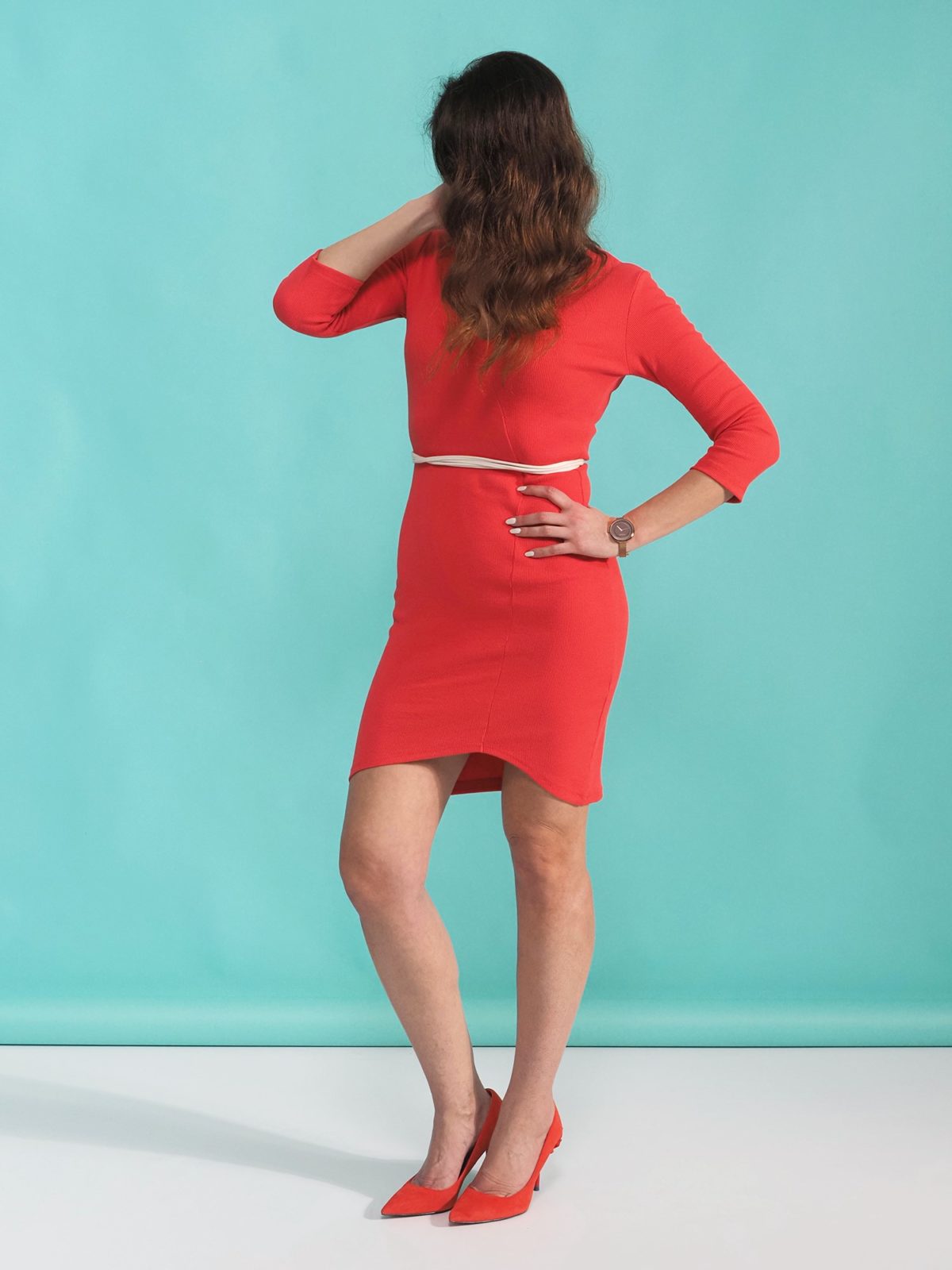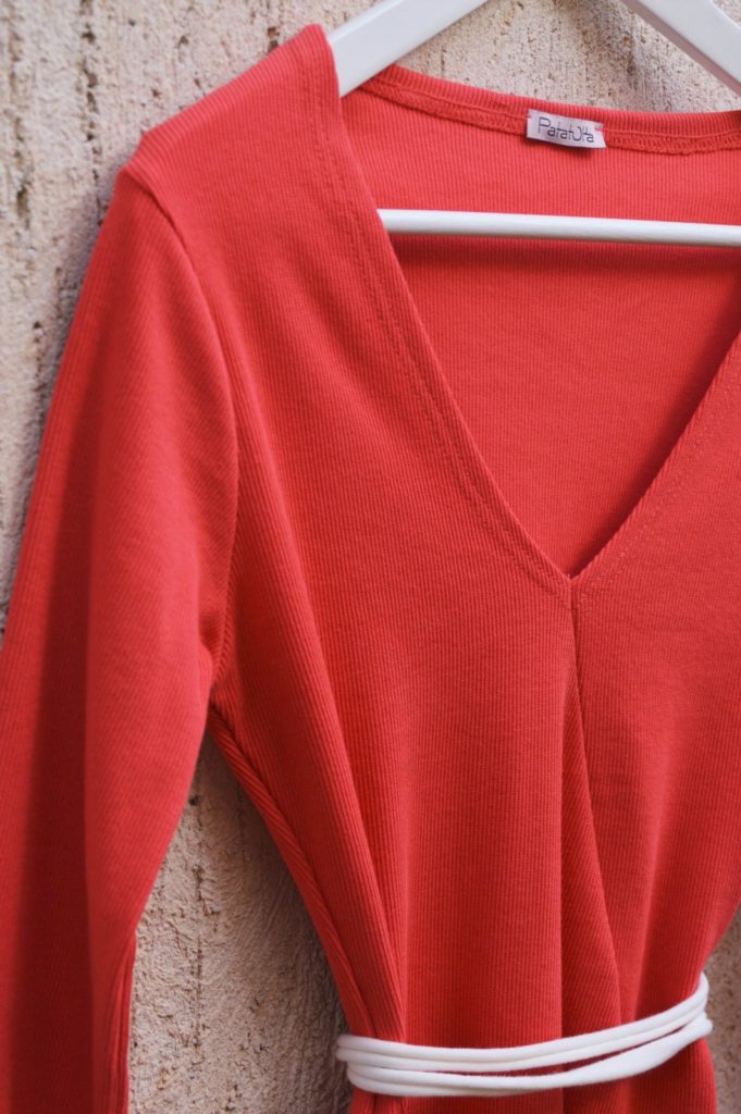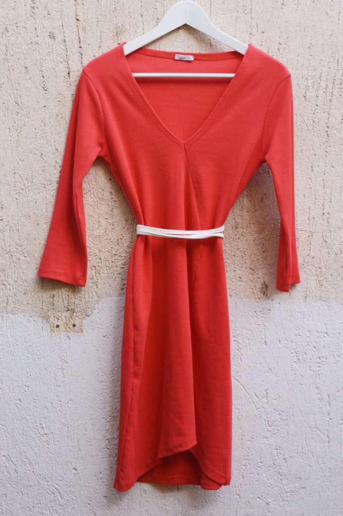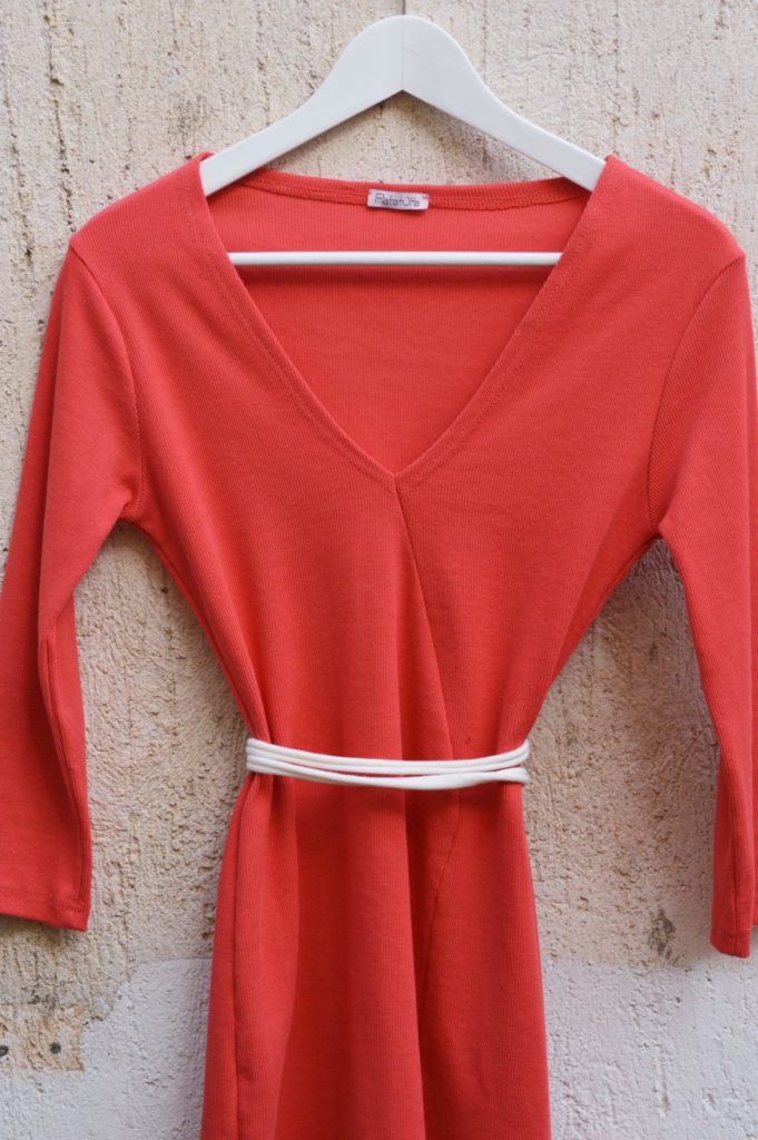 Μίνι βαμβακερό , εφαρμοστό ρίπ φόρεμα , σε απόχρωση στον τόνο του φούξια κοραλιού ,με μανίκι τριών τετάρτων , και άνοιγμα V στο ντεκολτέ! Με ιδιαίτερη ραφή στο εμπρός μέρος , σε γραμμή κρουαζέ , και άνοιγμα στο κάτω μπροστινό μέρος!