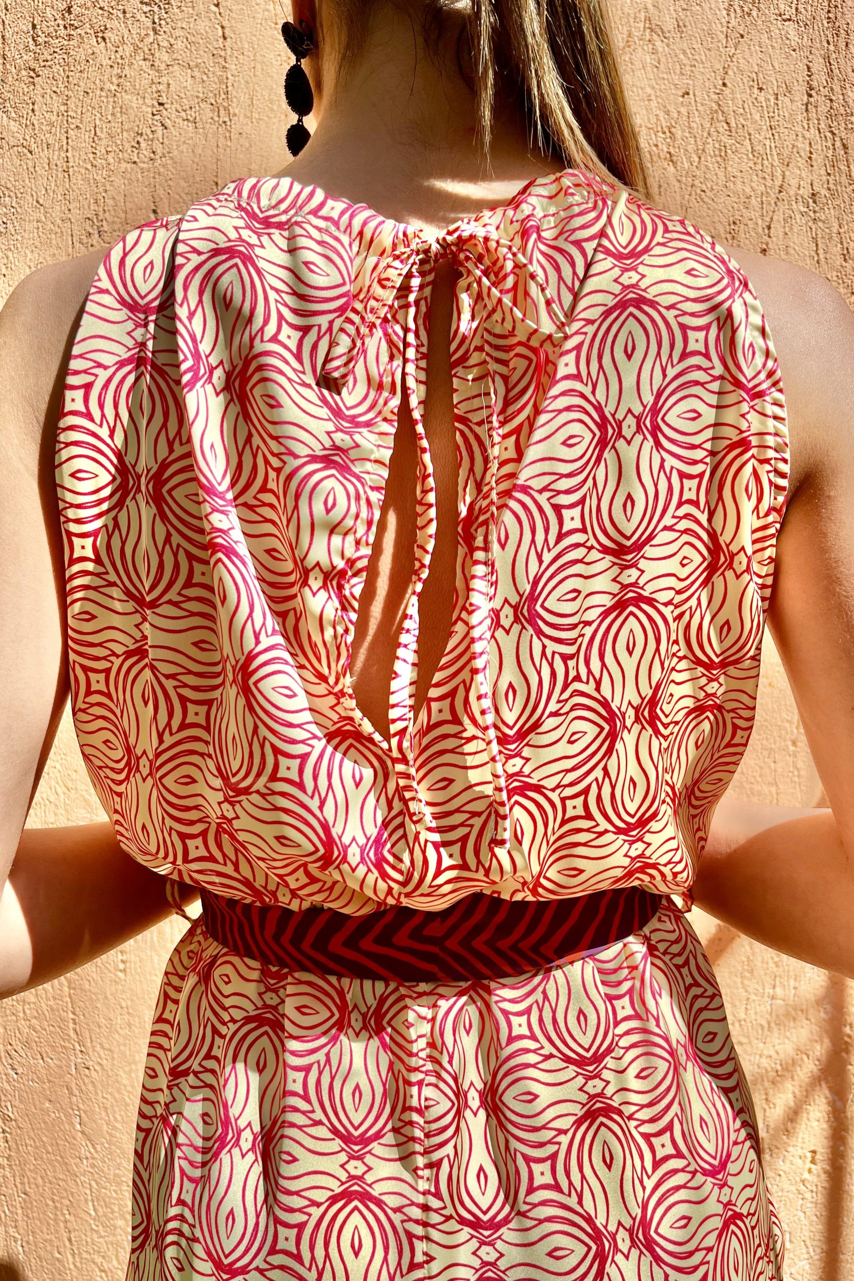 Μάξι φόρεμα,με παρτούς ώμους ,ανοίγματα στο μπούστο , στην πλάτη και στα πλαϊνά της φούστας!Με λάστιχο στη μέση για να εφαρμόζει τέλεια,και ζώνη από διαφορετικό ύφασμα!Δέσιμο πίσω στον λαιμό!Φτιαγμένο από ανακυκλωμένο πολυεστερικό ύφασμα!