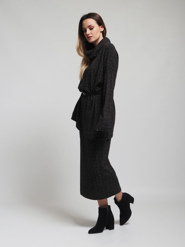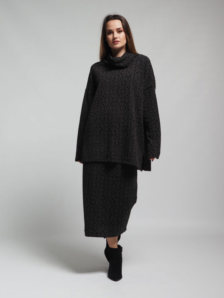- Πλεκτό σετ που αποτελείται από μακριά,oversized ζιβάγκο μπλούζα με ανοίγματα στα πλαϊνά και μαύρο μοτίβο που θυμίζει γλυκάνισο , και στενή midi φούστα ! Διαθέσιμο σε δύο μεγέθη , που καλύπτουν μεγάλη γκάμα διαστάσεων !Παρακαλούμε συμβουλευτείτε τον πίνακα μεγεθών μας ,για να βρείτε το δικό σας μέγεθος με ακρίβεια!