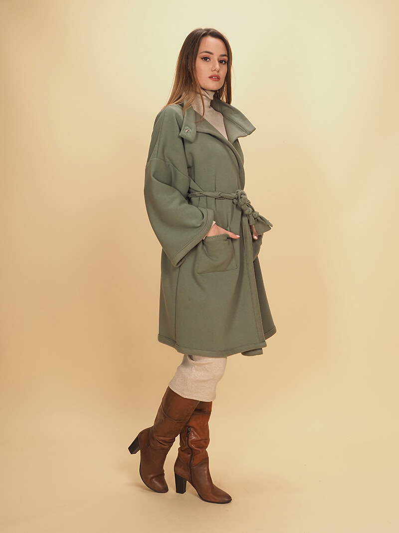- Φούτερ κάπα, φτιαγμένη από τρίκλωνο, ενισχυμένο, φούτερ ύφασμα, με κούμπωμα στον όρθιο γιακά της. Με πλεκτή ζώνη φτιαγμένη από το ίδιο ύφασμα και εξωτερικές τσέπες. Φοριέται σκέτη λόγω του ζεστού της υφάσματος, ή και πάνω από πανωφόρι για παραπάνω προστασία από το κρύο! Σε φαρδιά γραμμή, με φαρδιά μανίκια!